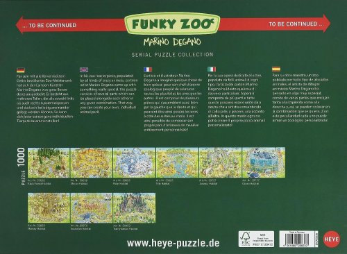 Chcete mať doma vlastnú ZOO? Vytvorte si ju z puzzle zo série HEYE, ktorú vtipne stvárnil známy karikaturista Marino Degano. Jednotlivé motívy so zvieracími "pavilónmi" je možné zavesiť vedľa seba v ľubovoľnej kombinácii a vytvoriť tak ZOO podľa vlastných predstáv. Okrajové prvky (obloha, rieka, kríky, cesta) sú totiž namaľované tak, aby na seba obrázky zo série Šílená ZOO vždy nadväzovali, nech už sú poskladané v akomkoľvek poradí. Rozmer zloženého puzzle cca 70 x 50 cm