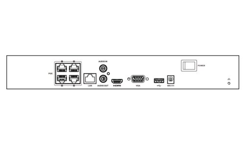 Porty: 1× HDMI, 1× VGA, 4× RJ-45 (PoE 802.3af/at), 1× 10/100 Mbps RJ-45, 1× audio vstup (RCA), 1× audio výstup (RCA), 2 × USB 2.0