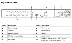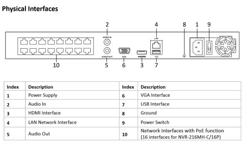 Okrem 16 PoE portov ponúka samostatný Gigabit Ethernet port na pripojenie k sieti. Podporuje až 32 súčasných vzdialených pripojení a kompletnú sadu sieťových protokolov vrátane DHCP, DDNS, RTSP a UPnP.