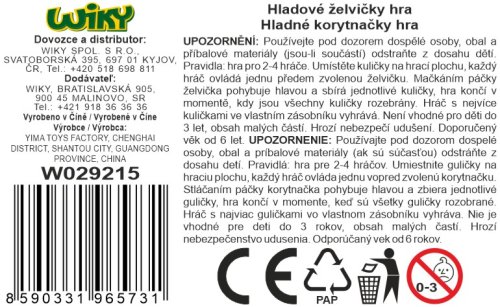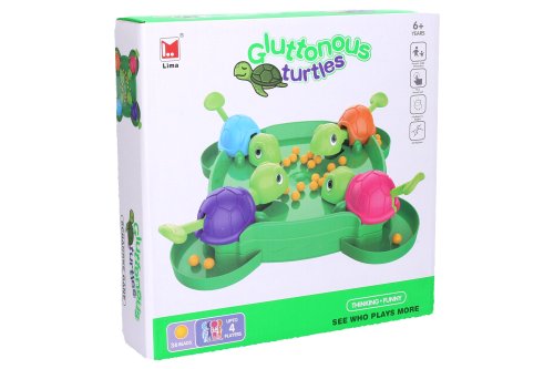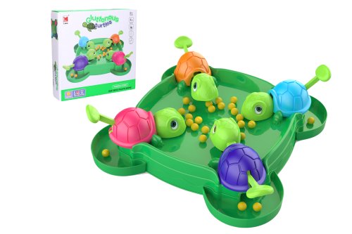 Až 4 hráči. Rozmer hracej plochy 23x23x5 cm. Obsah balenia - hracia plocha, 36 guličiek, 8 samolepiek očí pre korytnačky. Vysypte všetky korálky na hraciu plochu a snažte sa ich čo najviac zjesť. Korytnačka, ktorá zje najviac korálok, vyhráva. Páčka v zadnej časti panciera slúži na ovládanie hlavy korytnačky.