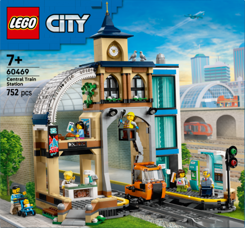 Darujte nápaditým deťom od 7 rokov stavebnicu LEGO® City Hlavná vlaková stanica plná funkcií V krabici nájdete všetko, čo deti potrebujú na zostavenie vlakovej stanice a údržbárskeho vozidla so zdvíhacou plošinou, 6 minifigúrok, figúrku bábätka a 2 figúrky výjazdov hodinovú vežu, riadiacu miestnosť, kaviareň a posedenie s priehľadnou strechou Táto stavebnica obsahuje herné doplnky, vrátane telefónu, lístka, croissantu a hrnčeka