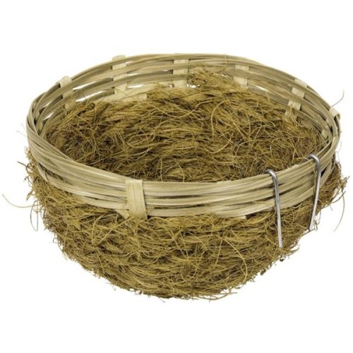 Prútené hniezdo pre drobné exoty opatrené drôtikmi na zavesenie do klietky. Priemer hniezda: 12 cm, výška: 8 cm.