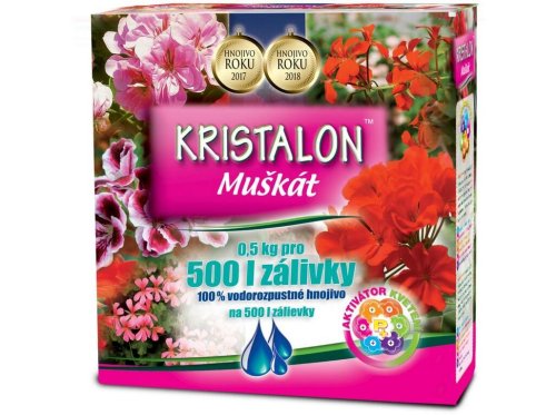 KRISTALON Muškát – hnojivo novej generácie je kryštalické, vodorozpustné hnojivo s unikátnym zložením a aktivátorom kvitnutia. Udržuje rastliny stále v intenzívnom raste, so silnými a dlhými výhonkami. Zaisťuje sýte farby kvetov, bohaté kvetenstvo a bujný koreňový systém. Hnojivo je použiteľné aj pre ostatné balkónové rastliny – surfínie, begónie, fuchsie, lobelky, bakopy, vejárovky, gazánie, kaukliarov a ďalšie. Zamedzuje žltnutiu listov.