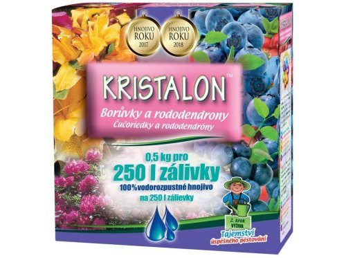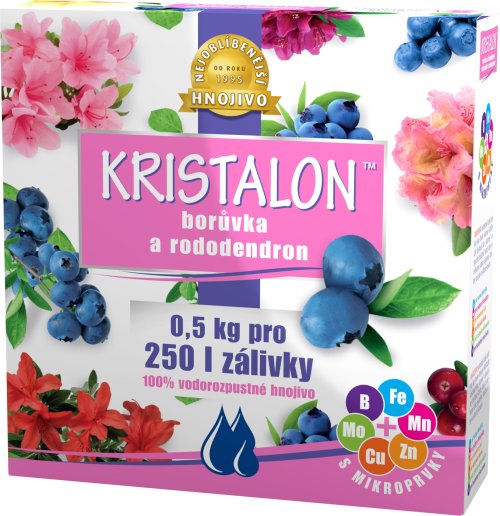 KRISTALON Čučoriedky a rododendron je kryštalické hnojivo, vodorozpustné a určené pre rododendrony, azalky, čučoriedky a vresovce a iné kyslomilné rastliny. Prispieva k lepšiemu zakladaniu kvetov, ktoré sú potom viditeľné a veľké. kyslomilné rastliny.