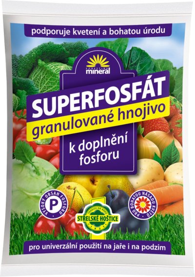 Najrozšírenejšie fosforečné hnojivo (koncentrované) – vodorozpustná forma znamená rýchly účinok hnojiva. Fosfor – podporuje tvorbu koreňového systému a násadu kvetov, umožňuje využitie slnečnej energie rastlinou na jesenné a jarné hnojenie. Vhodné na pridávanie do kompostov. Dávkovanie: 1 kg hnojiva vystačí cca na 17 – 50 m2 podľa typu rastliny.