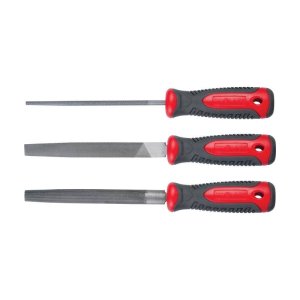pilníky - sada 3 ks vyrobené z tvrdenej ocele (60HRC) rukoväť protišmyková z TPR pilníky: plochý, polguľatý, trojhranný pracovná dĺžka: 200 mm hrubosť: 2