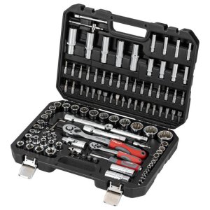 Kombinované kliešte 6“ Kliešte s dlhými čeľusťami 6“ 8 ks 3/8“ nástrčné hlavice: 8, 9, 10, 11, 12, 13, 14, 17 mm 1 ks 3/8“ račňa 1x 6“ nastaviteľný kľúč 8 ks kľúčov 1,5 - 6 mm 2 ks skrutkovačov: …