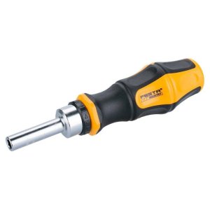 Račňový skrutkovač s držiakom bitov 1/4, CrV, ergonomická dvojkomponentná mäkčená rukoväť, otvor pre páku, magnetická koncovka.