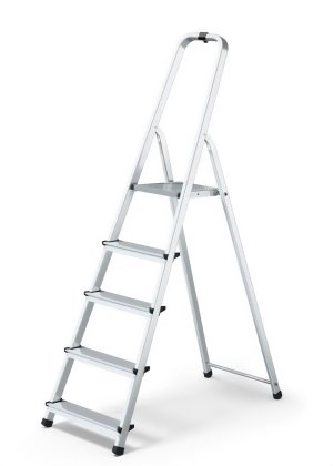 Typ - 1x5 jednostranné s madlom Pevná 5-stupňová rebríková konštrukcia s jednostranným vstupom Bezpečné madlo 60 cm Široká pracovná plošina 25 cm x 26 cm Vrúbkovaná plocha schodíkov.