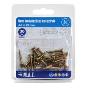 rozmery (pr. x D)): 4,0 x 40 mm materiál: Zn celozávit 25 ks Univerzálny vrut je spojovacia súčiastka s vonkajším závitom, určená na vytváranie rozoberateľných spojov predovšetkým mäkkých materiálov (drevo, plast, …