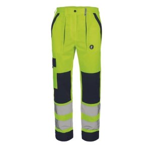 Dámske HI-VIS pracovné nohavice s elastickým pásom 2 predné vrecká, 1 stehenné vrecko, 2 zadné vrecká so zapínaním na suchý zips 2 šité 7,5 cm široké reflexné pruhy na spodných častiach nohavíc Zosilnená oblasť …