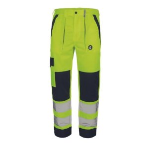 Pánske HI-VIS pracovné nohavice s elastickým pásom 2 predné vrecká, 1 stehenné vrecko, 2 zadné vrecká so zapínaním na suchý zips 2 šité 7,5 cm široké reflexné pruhy na spodných častiach nohavíc Zosilnená oblasť …
