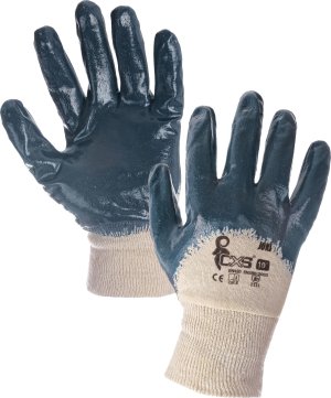 Ochranné pracovné rukavice bavlnené s pružným nápletom na zápästí, máčané v modrom nitrile.