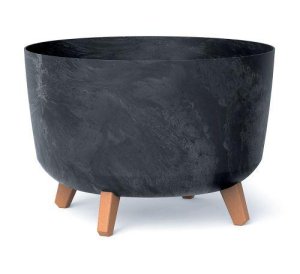 Matný, plastový, samozavlažovací kvetináč na krátkych nôžkach vo funkcionalistickom štýle s populárnym povrchom imitujúci betón a obľúbených farbách.