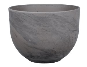 Keramický črepník veľmi elegantného, zaobleného tvaru, kruhového pôdorysu, s jedinečným zemito šedým sfarbením, s antracitovým mramorovaním.