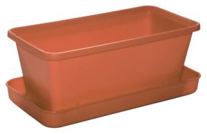 Plastový, matný kvetináč obdĺžnikového pôdorysu.