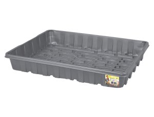 Šedá ľahčená v pôdoryse obdĺžniková plastová miska určená najmä na výsevy rastlín.