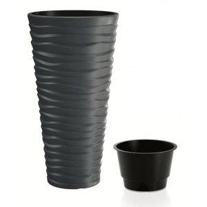 Vysoký kvetináč, objem 22 l, dizajn s textúrou vlniek, vhodný do exteriéru aj interiéru, v balení praktická vložka na sadenie rastlín, rozmery 29,7 x 53,1 x 29,7 cm, antracitová farba.