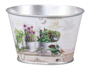 Plechový oválny obal na črepník je ozdobený obrázky slnečníc, motýlikov, pečiatok a nápisy. Šírka: 16 cm, výška: 10 cm, hĺbka: 10 cm.