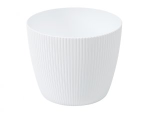 Plastový obal na črepník s unikátnym vzhľadom, zdobený zvislými pruhmi po celom obvode.