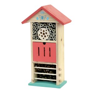 Drevený hmyzí hotel, praktická skrýša pre užitočné druhy hmyzu – samotárske včely, čmeliaky, motýle, pestránky, zlatoočka, slunéčka sedembodková či ďalší opeľovači alebo požierači otravných škodcov.