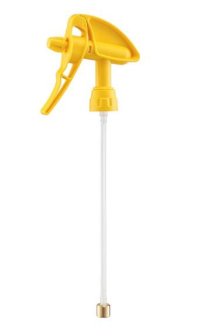 Žlto-modrý plastový ručný rozprašovač so závitom univerzálnym pre bežnú plastovú fľašu.