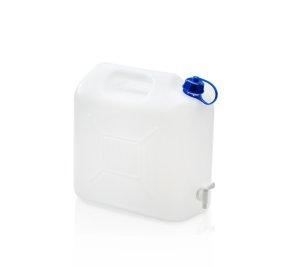 Plastový kanister 20 litrov s výpustným ventilom a sklopným uchom pre pohodlné prenášanie.