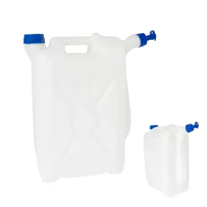 Pevný plastový kanister vhodný na pitnú vodu vybavenie uzáverom a výpustným hrdlom s tenkým zobáčikom.
