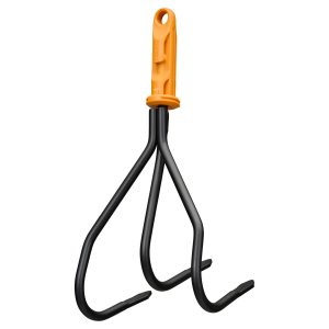 Oceľový ručný kultivátor určený na kyprenie pôdy.