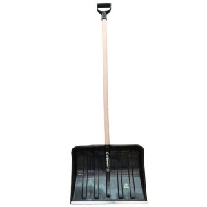 Hrablo na sneh s drevenou násadou a plastovou rukoväťou.