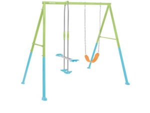 Oceľová hojdacia zostava Intex sa skladá z jednej klasickej výškovo nastaviteľnej hojdačky a druhej s dvoma pohodlnými sedadlami proti sebe.