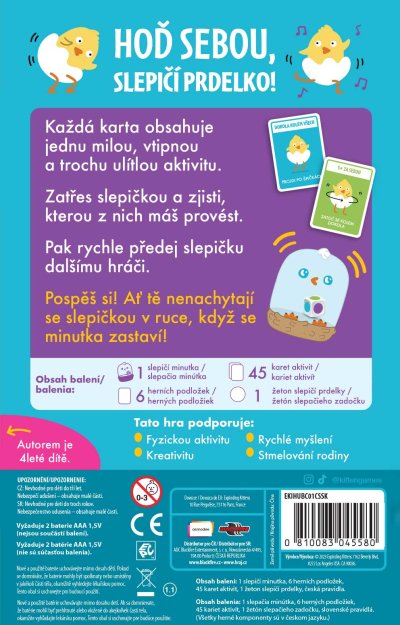 Hoď sebou, slepačie prdelko je Mačiatková hra od tvorcov Výbušných mačiatok. Táto hra spoločne s ďalšími mačiatkovými hrami vám garantuje skvelú zábavu aj s tými najmenšími. Za jej vznikom stojí štvorročné dievčatko, ktoré spoločne so svojim oteckom (Elan Lee - autor Výbušných mačiatok) vzalo papiere, fixky a nálepky a pustilo sa do vytvárania hier, pri ktorých sa budete baviť a zároveň sa aj niečo naučí te.O čom táto švihnutá slepačia hra je?Každá karta obsahuje jednu milú, vtipnú a trochu uletenú aktivitu. Zatraste sliepočkou a zistite, ktorú z nich máte urobiť. Po úspešnom vykonaní aktivity rýchlo odovzdajte sliepočku ďalšiemu hráčovi. Poponáhľajte sa! Nech vás nenachytajú so sliepočkou v ruke, keď sa minútka zastaví! Čo je cieľom hry? Čo najrýchlejšie plniť bláznivé aktivity a nenechať sa nachytať pri držaní sliepočky, keď sa minútka zastaví - táto hra dostane do varu ako deti, tak aj rodič . hra podporuje: fyzickú aktivitu, kreativitu, rýchle myslenie a rodinného ducha. Upozornenie: Hra vyžaduje 2 batérie AAA 1,5V, ktoré nie sú súčasťou balenia. Obsah balenia: 1 slepačia minútka 45 kariet aktivít 6 herných podložiek 1 žetón slepacej riťky 1 české a slovenské pravidlá