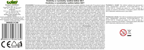 Hodinky a vysielačka walkie-talkie set. Rozmer hodiniek, vrátane antény, 9x6 cm. Obsahuje 2 hodinky, USB nabíjací kábel a návod. Dosah až 200 m. Nabíjacia, vstavaná batéria. USB nabíjací kábel je súčasťou balenia. LED baterka (spínač na pravom boku dole). ON/FF prepínač na pravom boku hore. 2 tlačidlá na prednej strane slúžia na nastavenie hodín. Tlačidlo na ľavom boku aktivuje vysielačku.