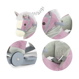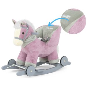 Mäkučký hojdací koník Polly bol navrhnutý pre najmladšie deti, pre ktoré sú tradičné hojdacie kone príliš veľké. Pohodlné a tvarované sedadlo v tvare kresla a nastaviteľné popruhy poskytujú pohodlie a bezpečnosť počas bezstarostného hojdania vášho dieťaťa. Opierky na nohy na lištách a rukoväti ešte viac pomáhajú udržať rovnováhu. Preklopením jednoduchého mechanizmu na lištách vysuniete kolieska, čím v sekunde zmeníte hojdaciu hračku na jazdiaceho koníka. Hojdacie lišty je možné jednoducho odskrutkovať. Po stlačení uška koník veselo zarechtá, po stlačení druhého vydá zvuk klusajúceho koňa. Batérie sa vkladajú do púdra umiestneného na brušku.<BR>Charakteristika:<BR>- drevené hojdacie lišty s opierkami pre nohy<BR>- hebký a príjemný materiál<BR>- pohodlné sedlo v tvare kresla<BR>- možnosť demontáže hojdacích líšt <BR>- batérie (2x AA) nie sú súčasťou hračky<BR>- nosnosť do 30 kg<BR>- od 12 do 36 mesiacov<BR> Rozmery:<BR>- výška 50 cm<BR>- výška na kolieskach +3cm <BR>- dĺžka líšt 68 cm<BR>- dĺžka koňa 51 cm<BR>- šírka 34 cm<BR>- výška sedla od zeme 32 cm<BR>- vzdialenosť sedadla od opierok 28 cm<BR>- šírka sedla 20 cm<BR>- výška operadla 15 cm<BR>Rozmery balenia:<BR>- 61x47x36 cm<BR>- hmotnosť netto 3,7 kg<BR>- hmotnosť brutto 4,7 kg