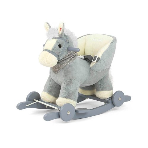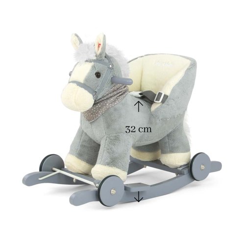 Mäkučký hojdací koník Polly bol navrhnutý pre najmladšie deti, pre ktoré sú tradičné hojdacie kone príliš veľké. Pohodlné a tvarované sedadlo v tvare kresla a nastaviteľné popruhy poskytujú pohodlie a bezpečnosť počas bezstarostného hojdania vášho dieťaťa. Opierky na nohy na lištách a rukoväti ešte viac pomáhajú udržať rovnováhu. Preklopením jednoduchého mechanizmu na lištách vysuniete kolieska, čím v sekunde zmeníte hojdaciu hračku na jazdiaceho koníka. Hojdacie lišty je možné jednoducho odskrutkovať. Po stlačení uška koník veselo zarechtá, po stlačení druhého vydá zvuk klusajúceho koňa. Batérie sa vkladajú do púdra umiestneného na brušku.<BR>Charakteristika:<BR>- drevené hojdacie lišty s opierkami pre nohy<BR>- hebký a príjemný materiál<BR>- pohodlné sedlo v tvare kresla<BR>- možnosť demontáže hojdacích líšt <BR>- batérie (2x AA) nie sú súčasťou hračky<BR>- nosnosť do 30 kg<BR>- od 12 do 36 mesiacov<BR> Rozmery:<BR>- výška 50 cm<BR>- výška na kolieskach +3cm <BR>- dĺžka líšt 68 cm<BR>- dĺžka koňa 51 cm<BR>- šírka 34 cm<BR>- výška sedla od zeme 32 cm<BR>- vzdialenosť sedadla od opierok 28 cm<BR>- šírka sedla 20 cm<BR>- výška operadla 15 cm<BR>Rozmery balenia:<BR>- 61x47x36 cm<BR>- hmotnosť netto 3,7 kg<BR>- hmotnosť brutto 4,7 kg