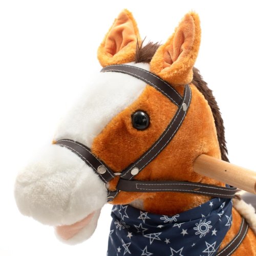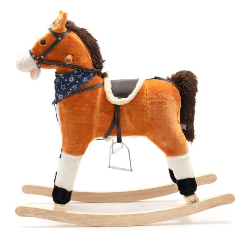 Neobyčajne krásny hojdací koník s červenou šatkou na krku. Po stlačení ušiek koník zavrtí chvostíkom, otvára ústa, vydáva zvuky klusajúceho koňa alebo spieva pesničku. Pohodlné sedlo, pevná uzda, drevené rukoväte alebo kovové strmene zaistia vašim kovbojom ešte väčšiu stabilitu a komfort počas hojdania. Je vyrobený z mäkkého plyšového materiálu, pevné drevené lišty alebo rukoväte je možné ľahko odskrutkovať. Batérie sa vkladajú do puzdra umiestneného na brušku koníka.