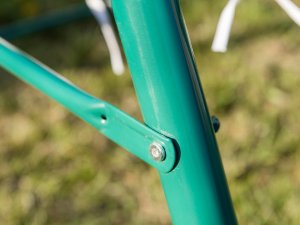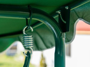 Záhradná hojdačka STRIPY II má kovovú konštrukciu ošetrenú práškovým lakovaním v zelenej farbe. Polyesterový sedák, výška 6 cm.