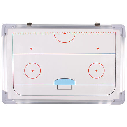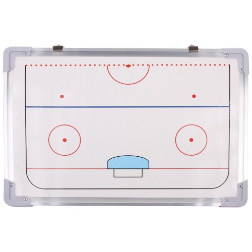 Trénerská tabuľa na hokej je nevyhnutný doplnok každého hokejového trénera naprieč všetkými súťaž emi. Taktick á hokejová tabuľa Merco HOKEJ 43 je obojstranná magnetická doska s farebným prevedením polovice z jednej strany az druhej strany celého hokejového ihriska v hliníkovom ráme. Súčasťou hokejovej tabule Merco HOKEJ 43 je 6+6 farebne rozlíšených magnetov, samolepky s číslami a čierny popisovač ktorého súčasťou je aj malá hubka. Závesná trénerská tabuľa Merco HOKEJ 43 je ideálny pomocník pre taktické porady v hokejovej šatni. Celkový rozmer tejto tabule je 45,5 x 30,5 cm a celková hmotnosť 650 g.