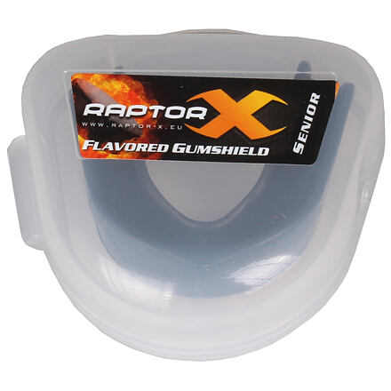 Kvalitný chránič zubov Raptor-X s príchuťou je vhodný na ľadový hokej a ďalšie kontaktné športy, je vyrábaný vo veľkostiach Junior a Senior. Tento chránič spĺňa bezpečnostné a hygienické normy. Príchute: červená = jahoda, zelená = pepermint, fialová = čierne ríbezle. Tvarovanie chráničov: 1. Ohrejte vodu v kanvici a nalejte ju do nádoby. 2. Ponorte chránič do vody na cca 10 sekúnd. 4. Chránič opláchnite pod tečúcou vodou izbovej teploty po dobu cca 1-2 sekúnd. 5. Po olíznutí svojich pier chránič umiestnite do pusy a za použitia zrkadla dbajte na správne umiestnenie uprostred Vašich úst. 6. Skúsnite a vysajte prebytočnú vodu a vzduch z chrániča. Nechajte skúsnuté cca 40 sekúnd. 7. Vyberte chránič a ponorte ich na 5 minút do studenej vody. 8. Vyskúšajte, či zuby sedia správne.