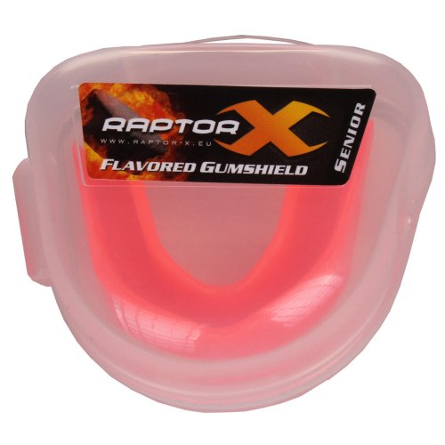 Kvalitný chránič zubov Raptor-X s príchuťou je vhodný na ľadový hokej a ďalšie kontaktné športy, je vyrábaný vo veľkostiach Junior a Senior. Tento chránič spĺňa bezpečnostné a hygienické normy. Príchute: červená = jahoda, zelená = pepermint, fialová = čierne ríbezle. Tvarovanie chráničov: 1. Ohrejte vodu v kanvici a nalejte ju do nádoby. 2. Ponorte chránič do vody na cca 10 sekúnd. 4. Chránič opláchnite pod tečúcou vodou izbovej teploty po dobu cca 1-2 sekúnd. 5. Po olíznutí svojich pier chránič umiestnite do pusy a za použitia zrkadla dbajte na správne umiestnenie uprostred Vašich úst. 6. Skúsnite a vysajte prebytočnú vodu a vzduch z chrániča. Nechajte skúsnuté cca 40 sekúnd. 7. Vyberte chránič a ponorte ich na 5 minút do studenej vody. 8. Vyskúšajte, či zuby sedia správne.
