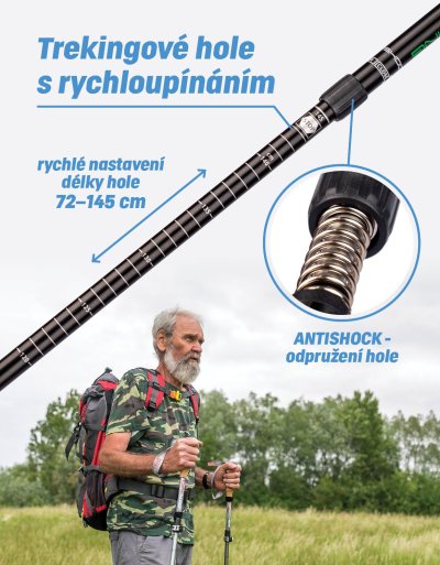 Chcete mať pevnejší krok a väčšiu radosť z pohybu? Vyskúšajte trekingové palice LTH138 značky Acra , ktoré vám budú skvelou oporou aj pri náročnejšej turistike. Sú odpružené systémom ANTISHOCK . Ich teleskopické prevedenie vám umožní nastaviť si dĺžku v rozpätí od 72 do 145 cm . Sú skutočne ľahké. Jedna palica sa skladá z troch dielov a váži iba 295 g . V balení nájdete aj sadu vymeniteľných krúžkov a gumové koncovky.
