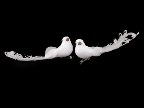 Dekoračnú [holubica] zdobia pôsobivé [kučeravé] pierka. Zospodu má pripevnenú kovovú sponu, vďaka ktorej ju môžete pripevniť napríklad na veniec, vetvičku, záclonu či ju naaranžovať do kvetinových väzieb. [Hodí sa na svadobné aj vianočné aranžovanie.] [Holubica] č. 2 má hlavičku ozdobenú glitrami.