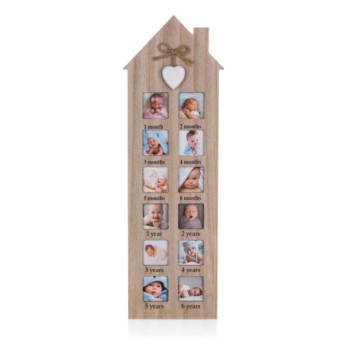 Fotorámik BABY 0-6 rokov 48 x 14,8 x 0,8 cm v tvare vysokého domčeka s komínom, je vybavený 6 okienkami 1 až 6 month a 6 okienkami 1 až 6 years (12 fotografií 5x5cm). Fotorámik je vybavený praktickým závesom na montáž na stenu.