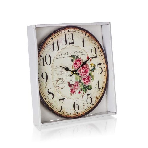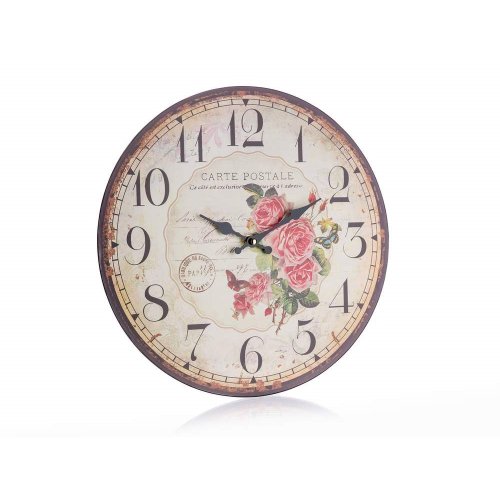 Nástenné okrúhle hodiny CARTE POSTALE s celoplošným dekórom s priemerom 34 cm. Hodinový strojček je napájaný jedným kusom batérie AA (nie je súčasťou balenia).