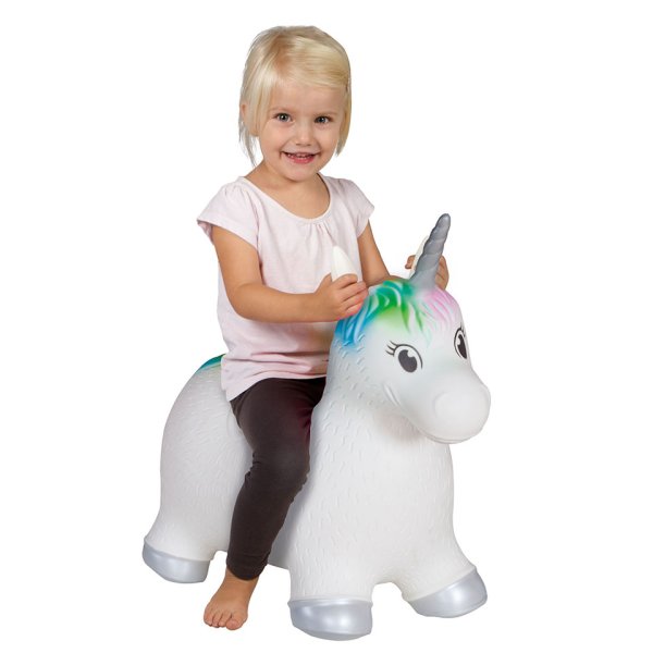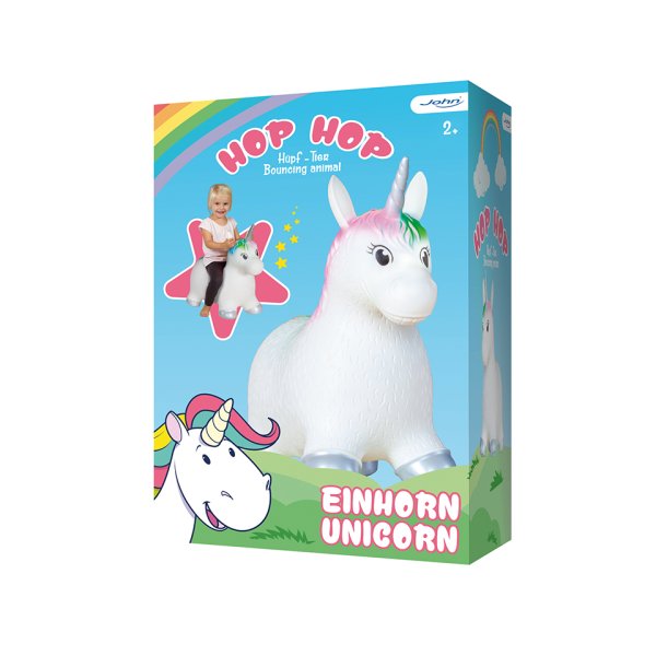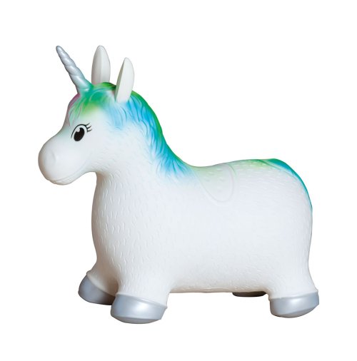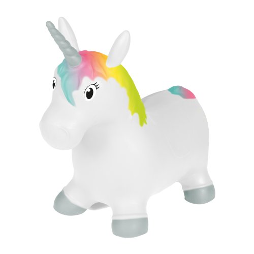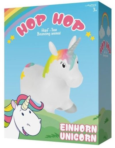 Hopsadlo HOPHOP jednorožec v bielej farbe s farebnou hrivou a farebným chvostíkom. Nosnosť do 50kg. Balené v krabici. Odporúčaný vek 2+. Rozmer nafúknutého hopsadla je 52x25x48 cm.
