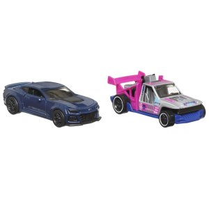Súprava obsahuje dva naťahovacie modely áut značky Hot Wheels v mierke 1:43, ktoré sú vyrobené predovšetkým z kovu s doplnkami z plastu. Každé autíčko má prepracovaný design, ktorý verne napodobňuje rôzne štýly vozidiel, od športových vozidiel cez terénne pickupy až po závodné špeciály a klasické hot rod modely. Farby sú živé a kontrastné, od červenej, modrej, oranžovej až po bielo-čierne či strieborné varianty, čo prispieva k atraktivite pre deti i zberateľov.