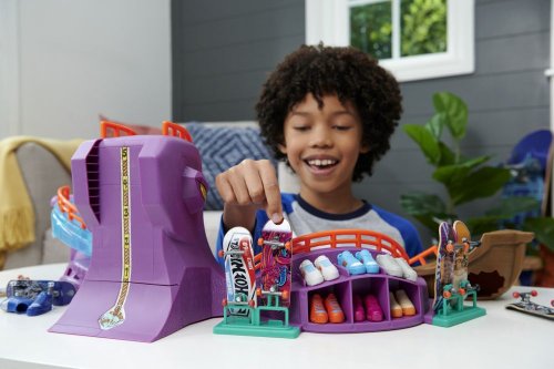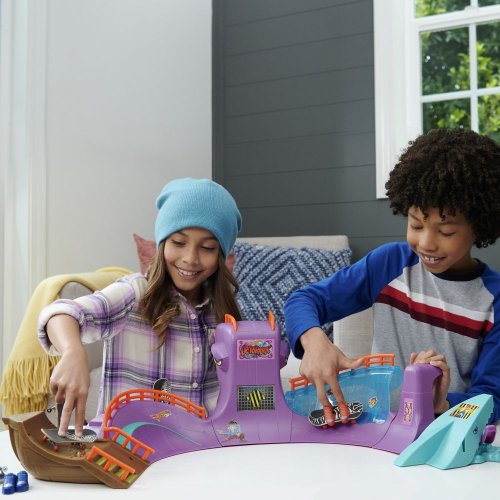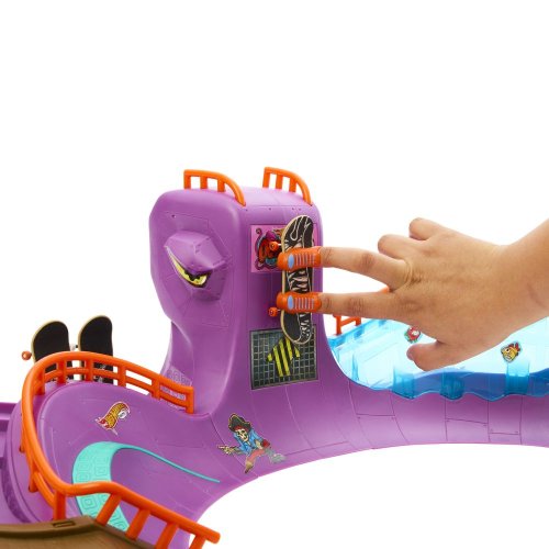 Rozbehnite to štýlovo na skate sade Hot Wheels Skate™ Octopark. Zoskočte z obrie hlavy chobotnice a pustite sa do epickej jazdy na fingerboarde, ktorá obsahuje grind raily, vertikálne quarterpipes a prekvapenie v podobe žraločieho chrbta. Súčasťou balenia je jeden exkluzívny, kompletne zostavený fingerboard a pár odnímateľných skate topánok. Do úložného priestoru na zadnej strane sa zmestia ďalšie tri dosky a päť párov topánok (ďalšie dosky a topánky sa predávajú samostatne.) Farby a prevedenia sa môžu líšiť. Obsahuje 1 sadu Hot Wheels Skate Octopark Skate Set s 1 exkluzívnym fingerboardom a 1 párom skate topánok.