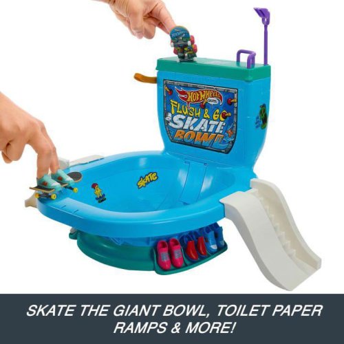 Stlačením páčky na toaletnej mise Hot Wheels® Skate parku spláchnite fingerboard a začnite trénovať! Tento set má úžasné skate povrchy vrátane obrovskej misy, rampy z toaletného papiera, nájazdovej rampy a grindovej dráhy, a navyše úložný priestor pre 4 fingerboardy a 6 párov topánok. Súčasťou balenia je jedna exkluzívna doska a jeden pár odnímateľných skate topánok.