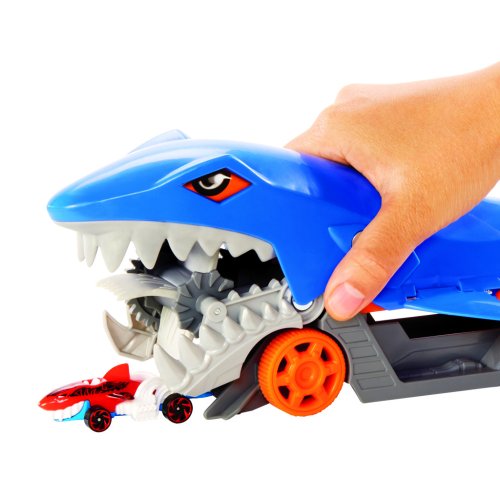 Hot Wheels® Žraločí ťahač je navrhnutý podľa ikonického autíčka Hot Wheels® Shark Bite™. Tento parádny žraločí ťahač chytí autíčko do svojich čeľustí a uloží ho do svojho brucha vďaka špeciálnemu požieraciemu mechanizmu, ktorý sa aktivuje, keď sa ťahač rozbehne. Potrebujete vyložiť? V zadnej časti ťahača je výstupná rampa, po ktorej zjedené angličáky ľahko vyjdú von. Hot Wheels® Žraločí ťahač sa dodáva s jedným angličákom Hot Wheels®, ale môže pojať až štyri ďalšie (predávajú sa samostatne)! Deti od štyroch rokov sa rady zahryznú do upratovania svojich autíčok vďaka tomuto ťahaču! Farby a vzhľad výrobku sa môžu líšiť.