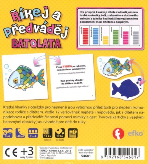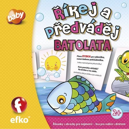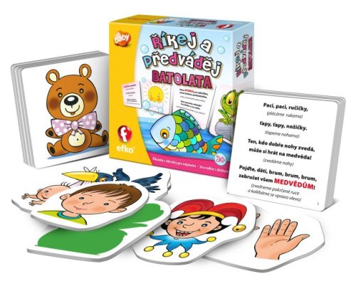 Riekanky s roztomilými obrázkami pre najmenších sú výbornou príležitosťou komunikácie rodičov s dieťaťom. Vedľa 12-tich veršovánok nájdete aj nápovedu, ako s dieťaťom napodobňovať a predvádzať činnosti pomocou mimiky a gest. Tvarované kartičky s veselými obrázkami sú vhodné do malých detských rúčiek. Hra prispieva k rozvoju dieťaťa v oblasti jemnej a hrubej motoriky, reči, zrakového a sluchového vnímania a taktiež ku kvalitnejšiemu vzájomnému porozumeniu medzi dieťaťom a dospelým. Balenie obsahuje: 12 ks kariet s riekankami, 12 ks kartičiek s obrázkami, návod Spoločenská hra pre deti od českého výrobcu EFKO.